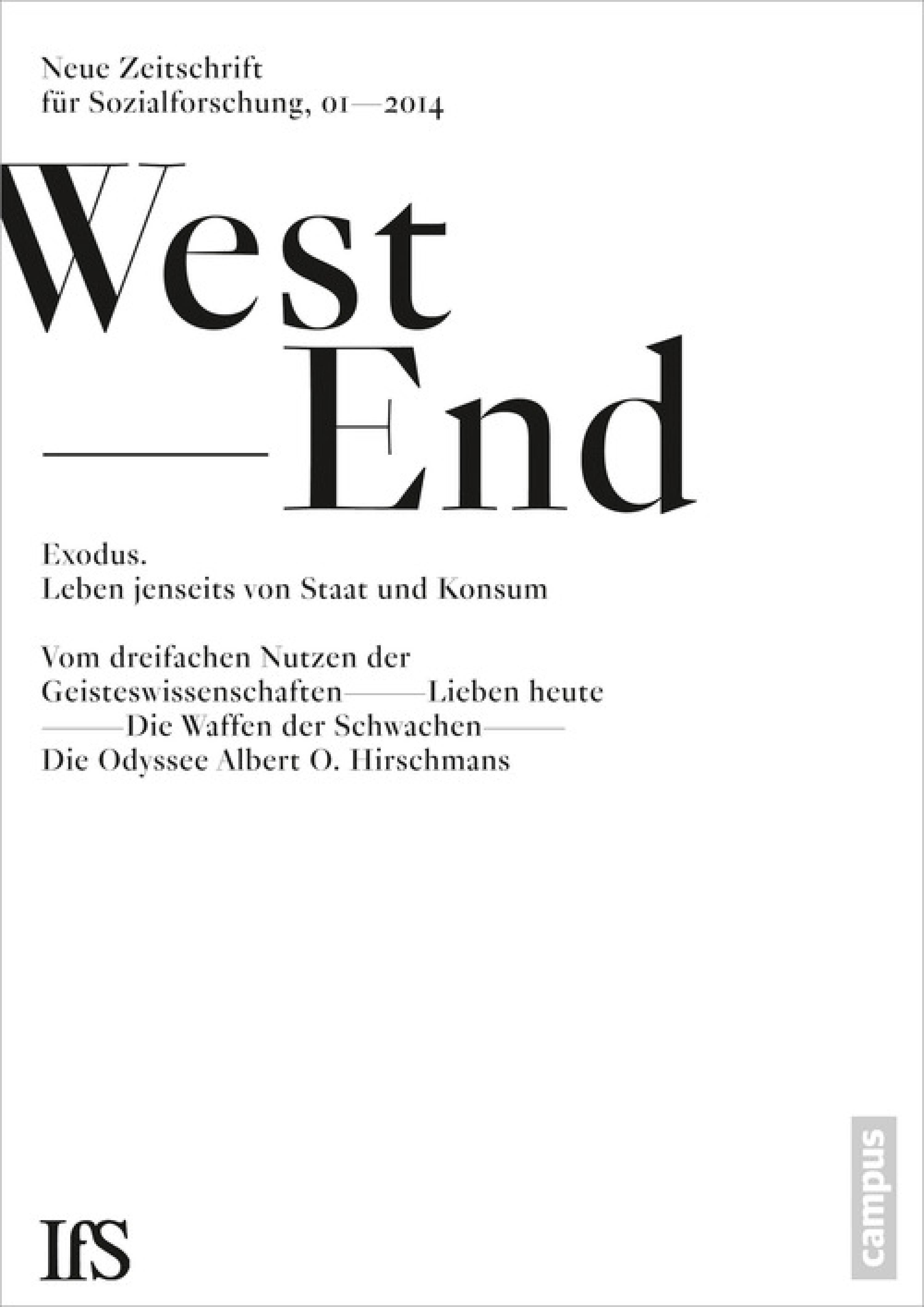 In Anlehnung an die berühmte »Zeitschrift für Sozialforschung« (1932 – 1941) verfolgt auch ihre seit 2004 halbjährlich erscheinende Nachfolgerin »WestEnd« den Anspruch einer kritischen Gesellschaftsanalyse. Zur Veröffentlichung kommen Aufsätze und Essays aus Soziologie, Philosophie, politischer Theorie, Ästhetik, Geschichte, Entwicklungspsychologie, Rechtswissenschaft und politischer Ökonomie. Neben den Rubriken »Studien« und »Eingriffe« behandelt jedes Heft ein Schwerpunktthema.